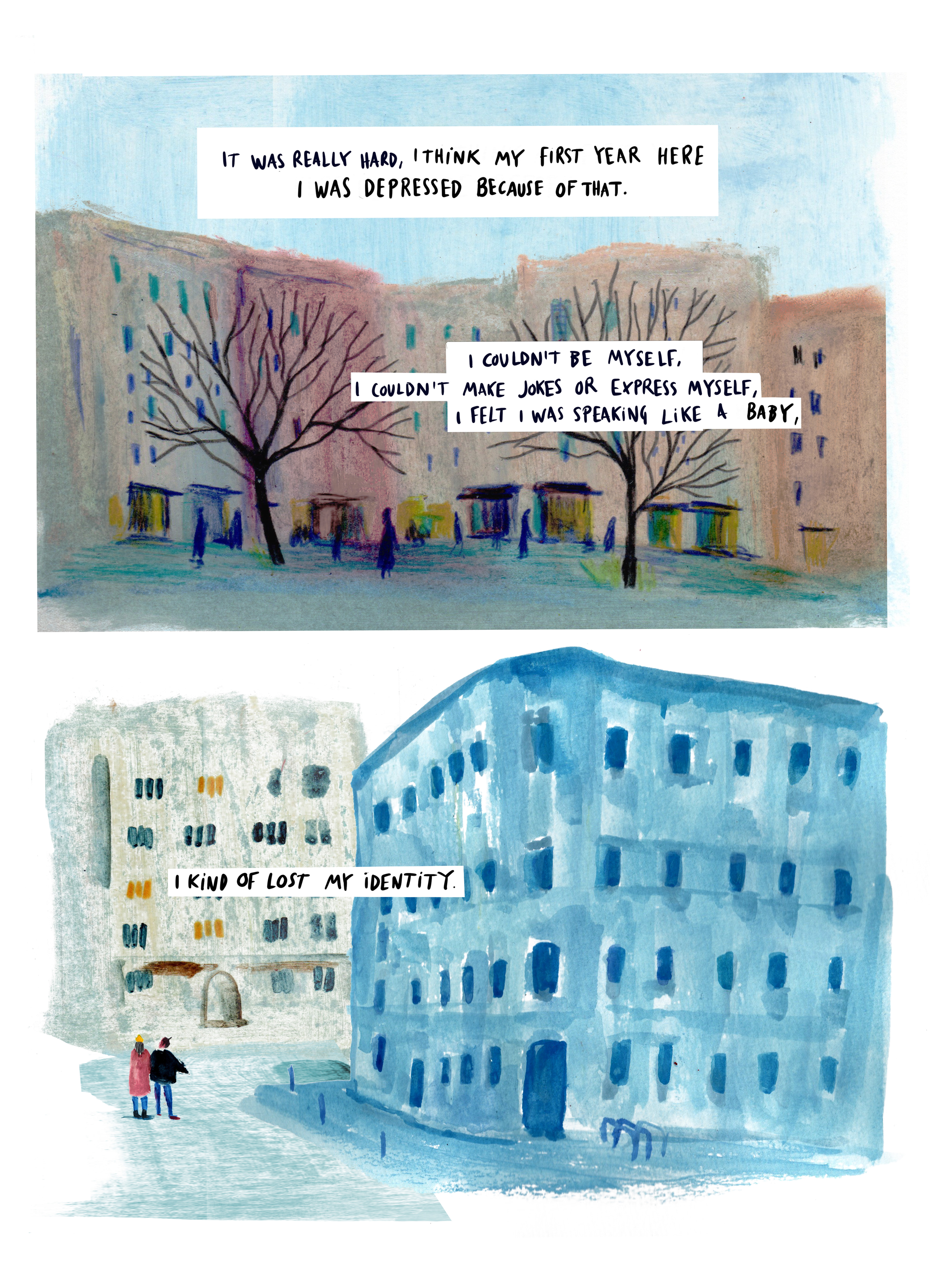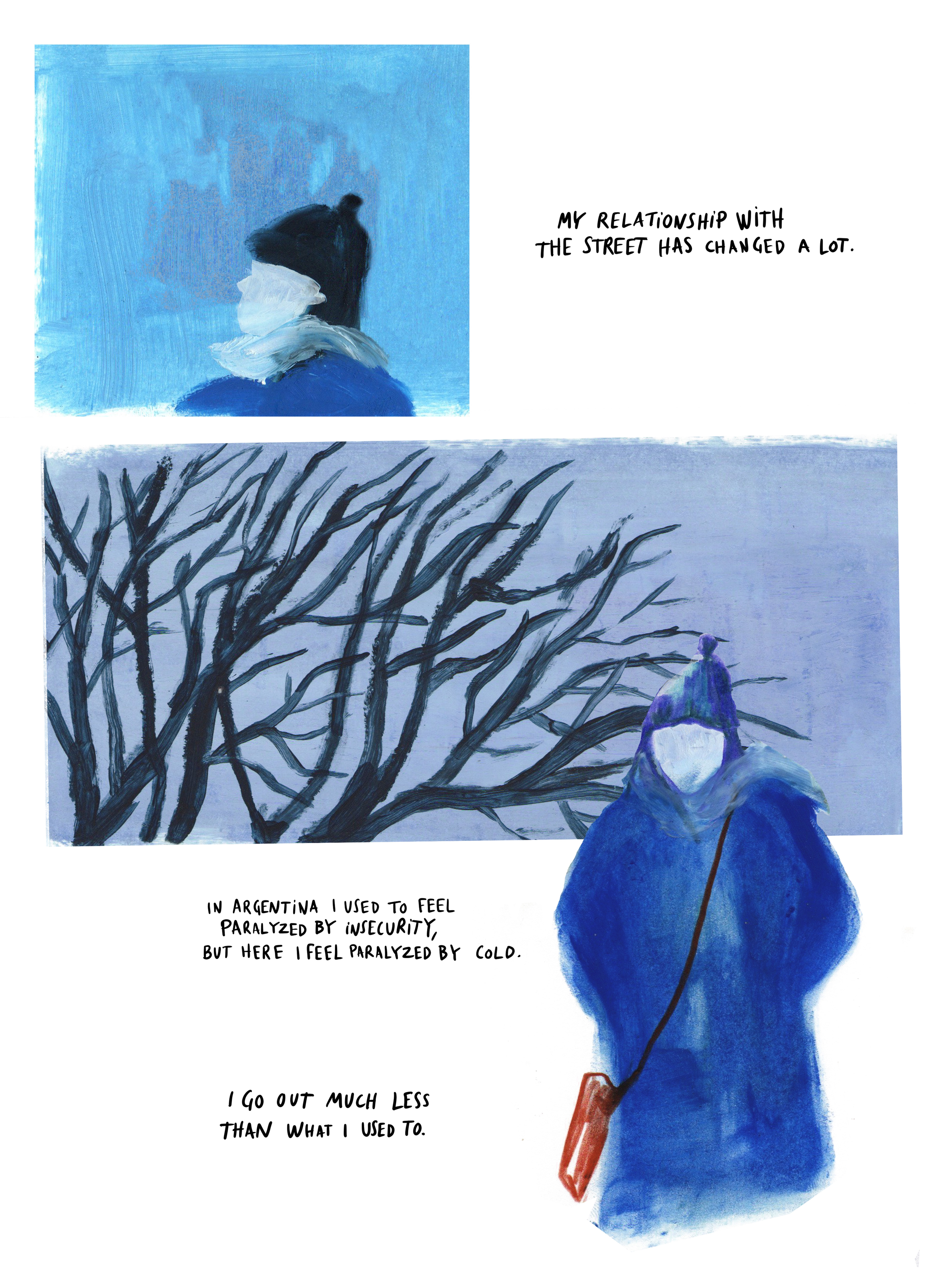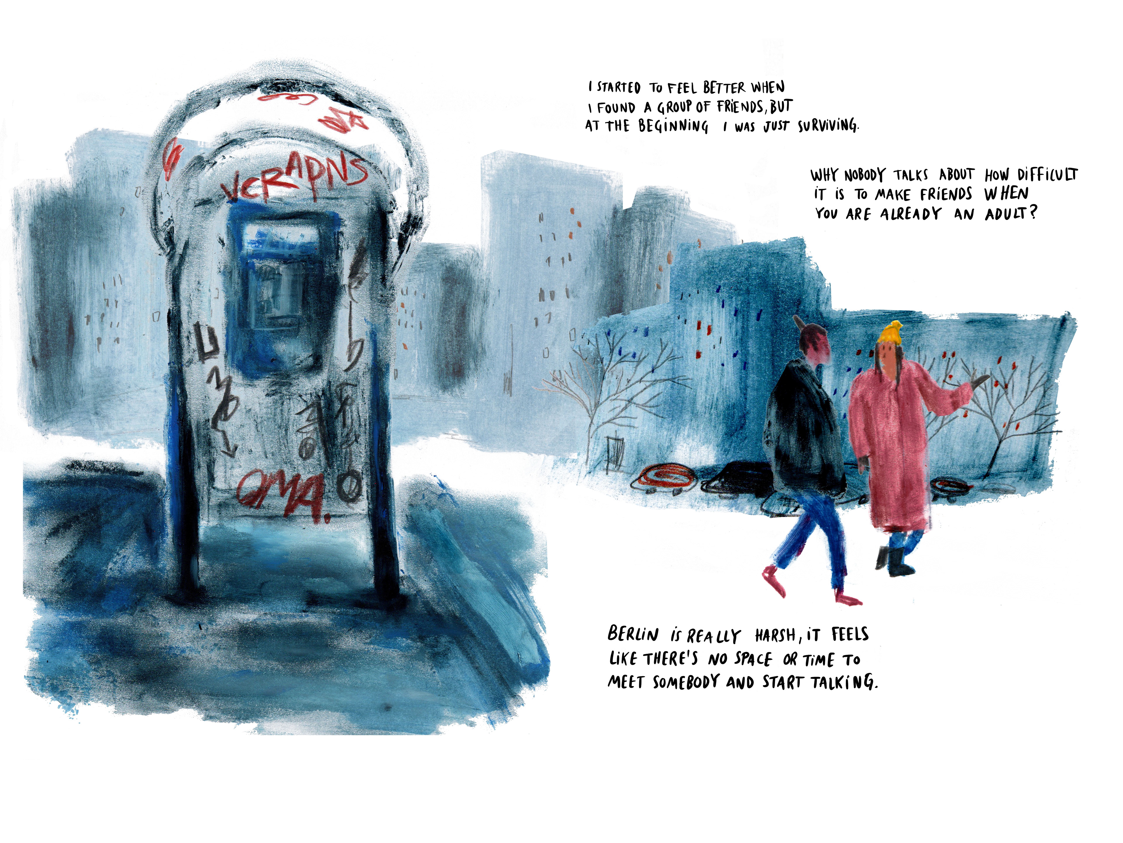 Through 10 interviews and a long berliner winter, I made this dreamy narration painting with oil sticks and gouache. The result is this 38 pages leporello book. Here there are some parts of it as