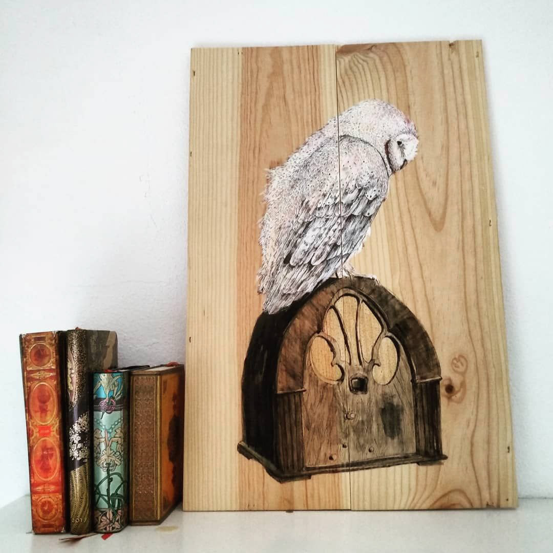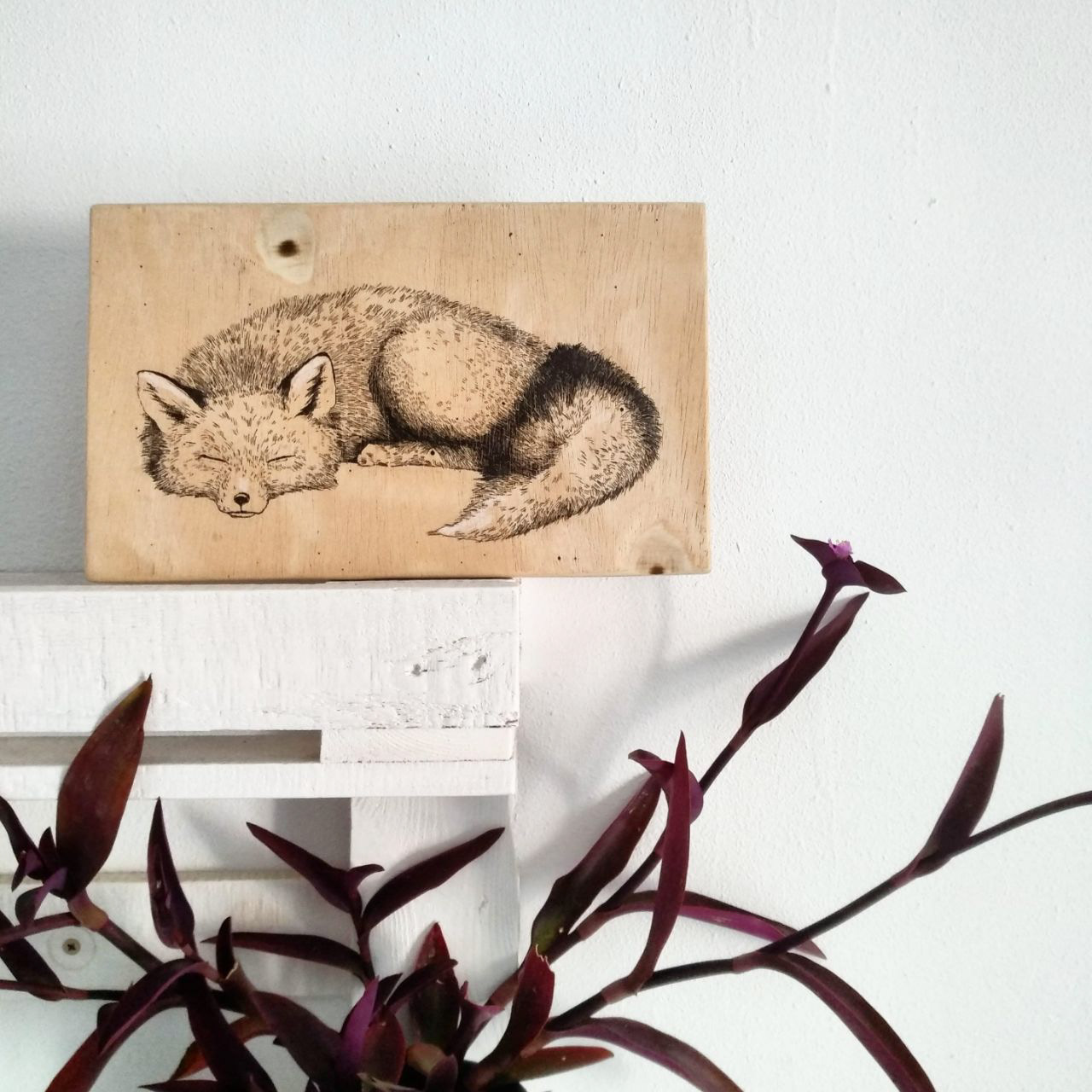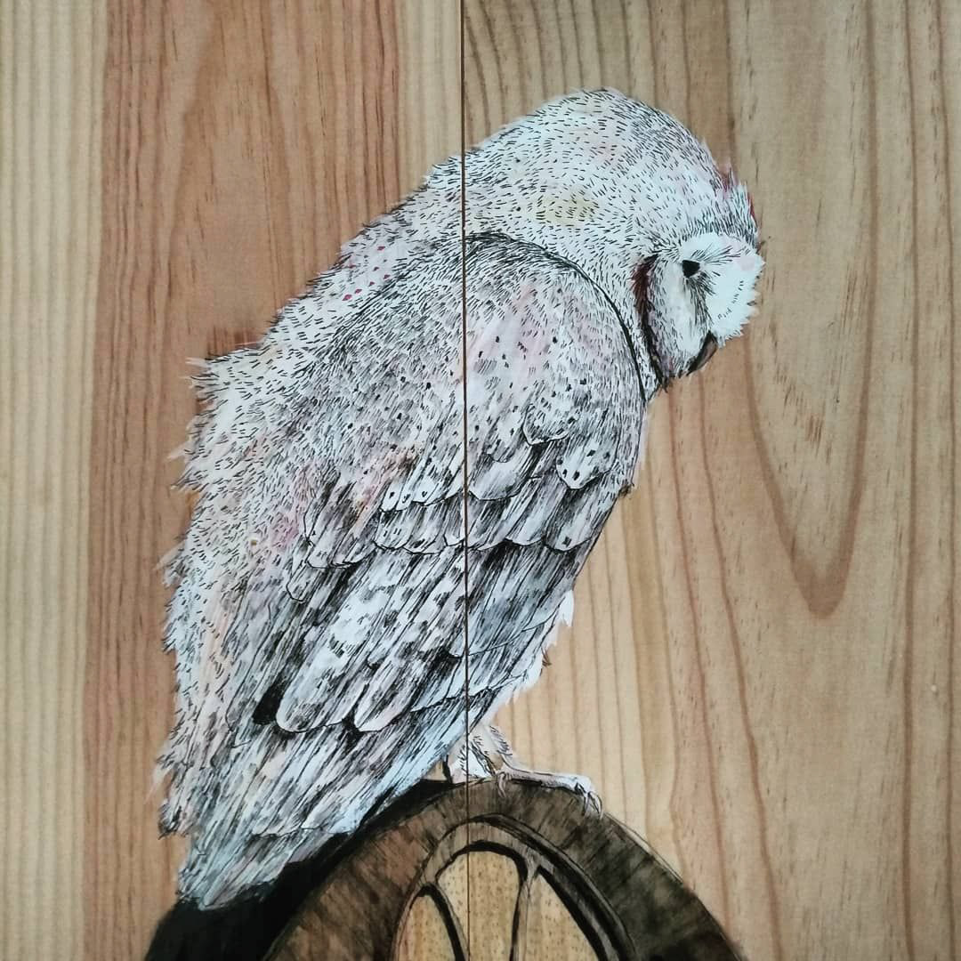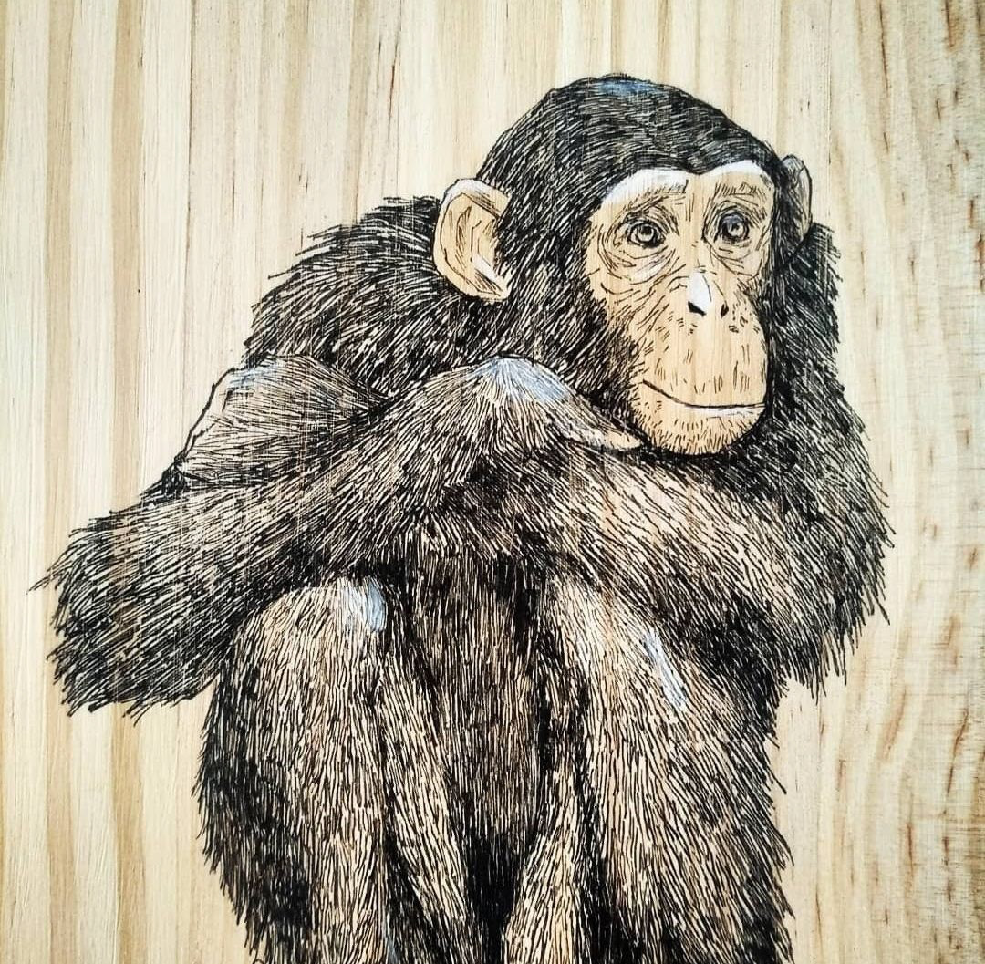 Dibujos de animales hechos con rotulador calibrado y lápiz blanco sobre madera