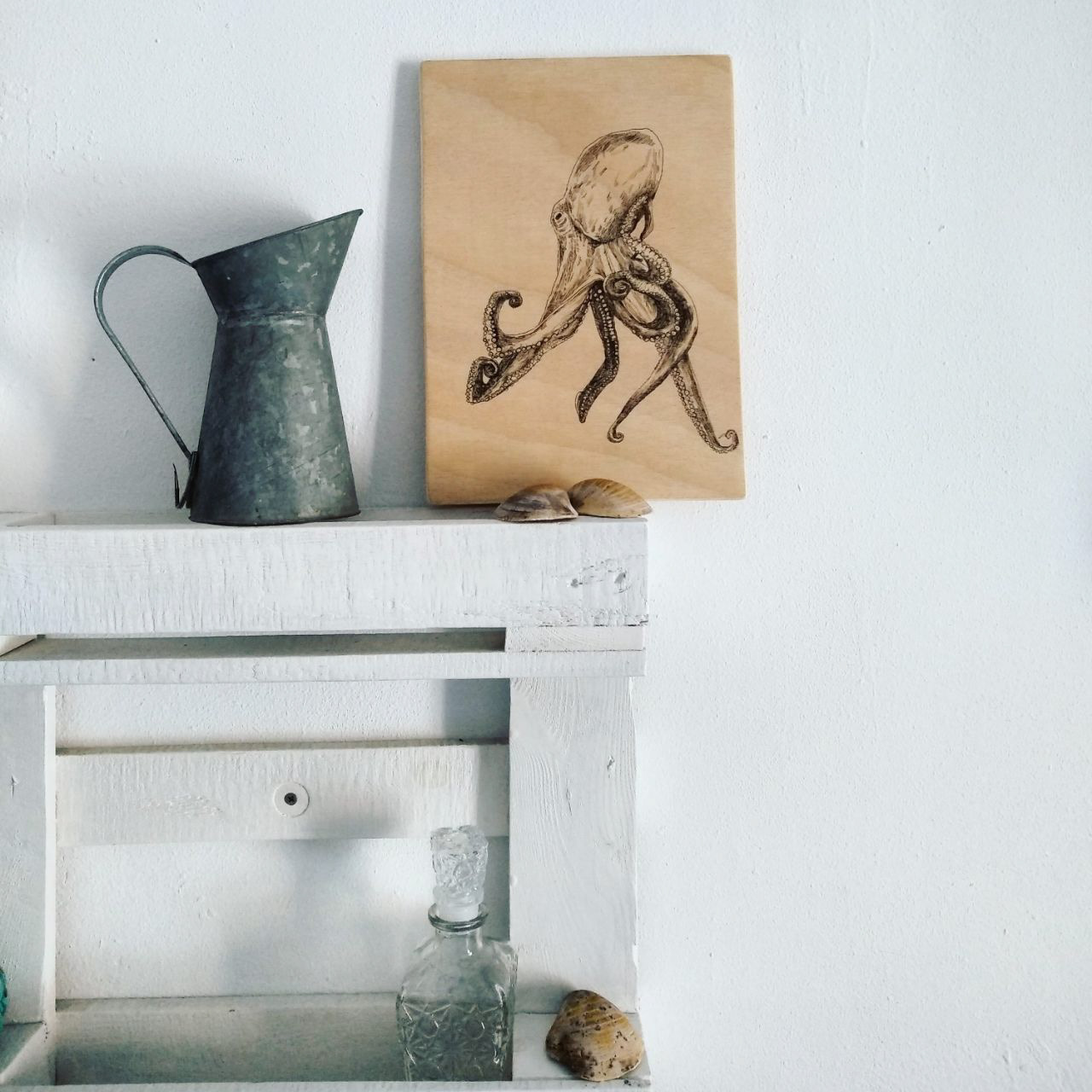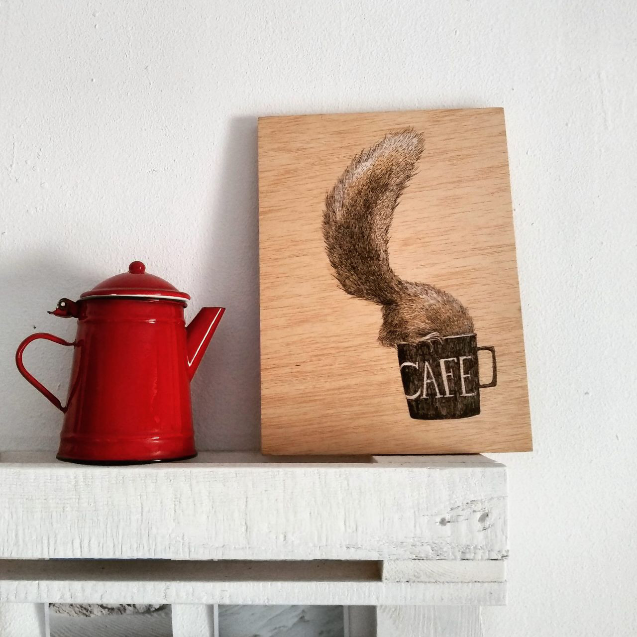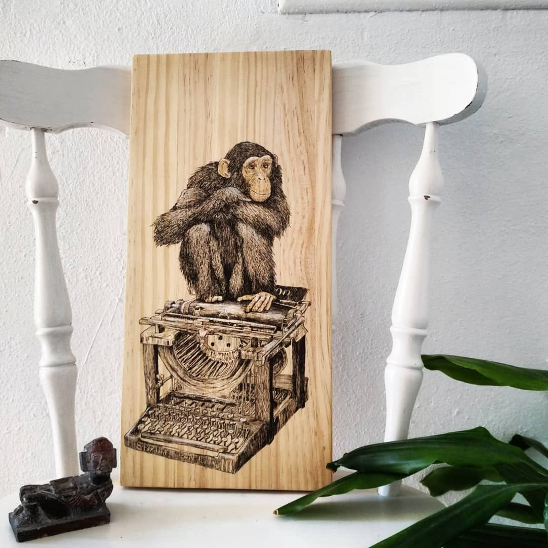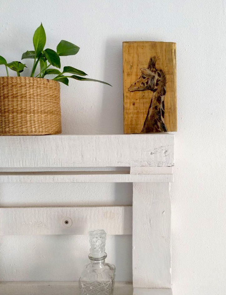 Dibujos de animales hechos con rotulador calibrado y lápiz blanco sobre madera